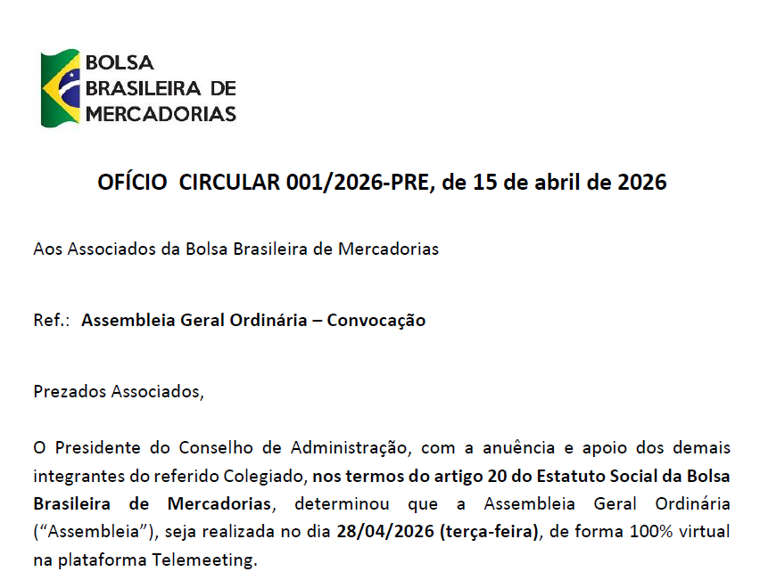 Encaminhamos, por meio desta mensagem, a convocação para a Assembleia Geral Ordinária da Bolsa, que será realizada no dia 28 de abril, às 10h.